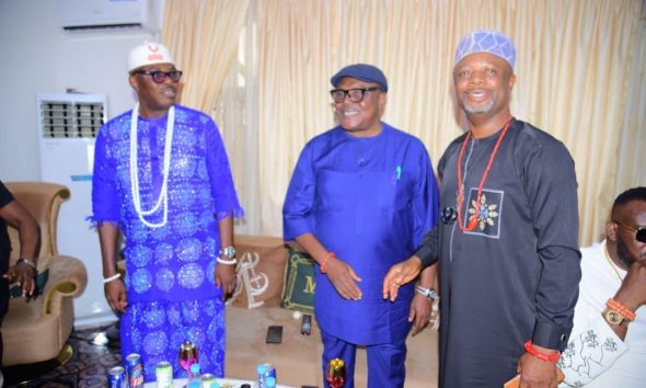 Delta State Governor, Senator Ifeanyi Okowa (3rd left); His Royal Majesty, Keagbokuzi l, the Dein of Agbor (3rd right); Hon. Victor Nwokolo (2nd right); Hon. Festus...